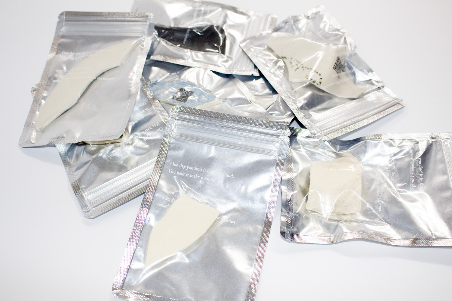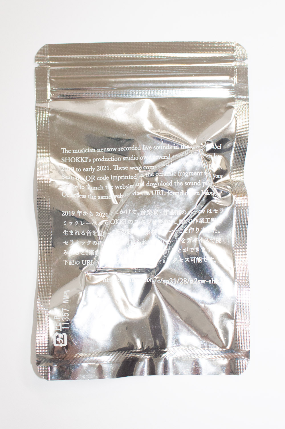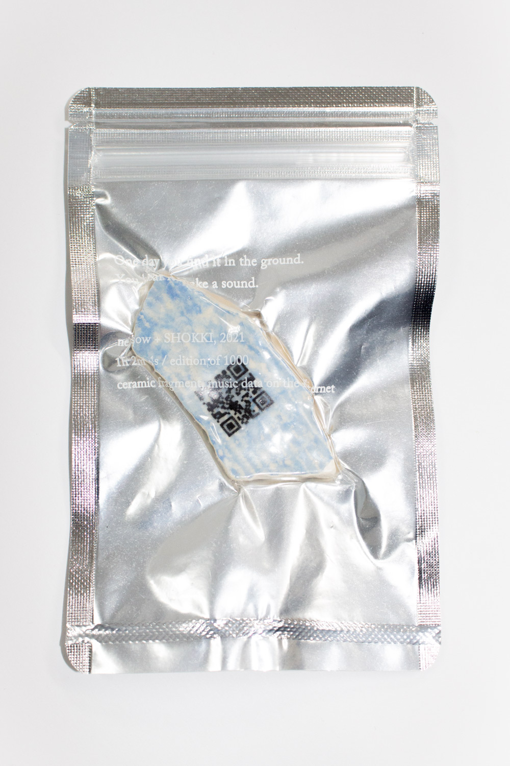 Music by nensow can be accessed through QR codes fired onto ceramic fragments. The track primarily features sounds recorded during at the SHOKKI studio, resulting in approximately one hour of music. Ceramic is difficult to deteriorate due to the nature of the material, and maybe someone will find this piece in the ground a thousand years or so from now and listen to the music.